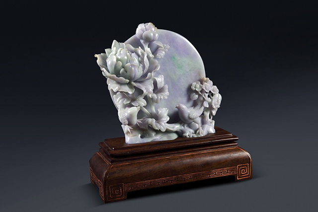 采用立雕形式構思設計,主體以象征富貴的牡丹、象征好運的喜鵲及象征圓滿的圓月構成?;ㄩ_富貴牡丹,喜兆吉祥喜鵲,幸福美滿圓月共同寄托了“愿花長好,人長健,月長圓”的良好祝愿。高檔紫色玉面,帶點俏色,實為罕見,細膩縝密,質感柔潤,刀法簡潔而傳神,為翡翠中不可多得之上品。