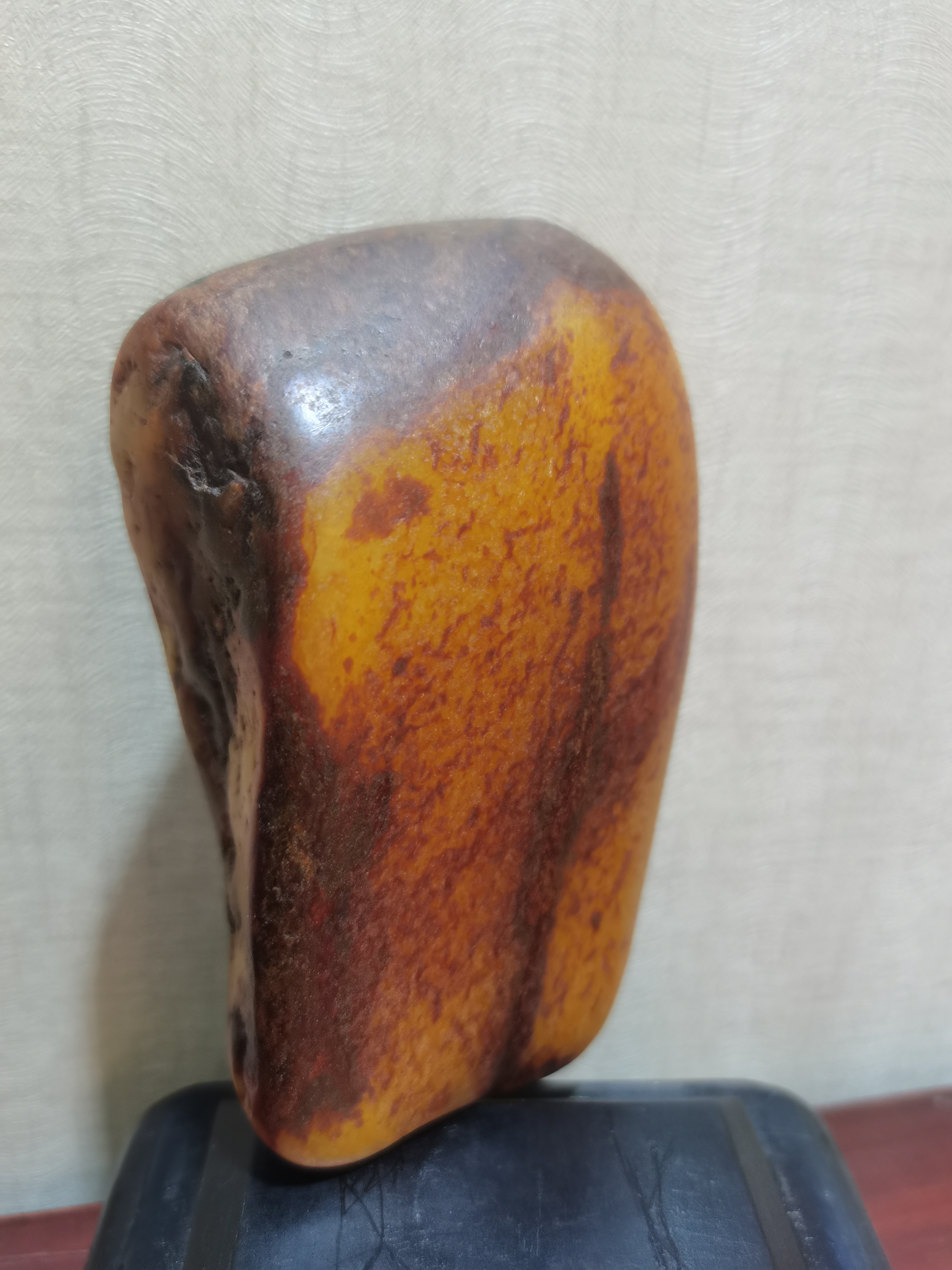 此款棗紅皮籽料,質地細膩,色澤濃郁,顏色分布深淺不一,極有質感。天然獨籽,極其難得,通體紅油皮,天然斷口,渾然一體,原石老熟渾厚,韌性強,油性極佳,稍盤就冒油。是極具稀缺性和保值性的賞盤極品。