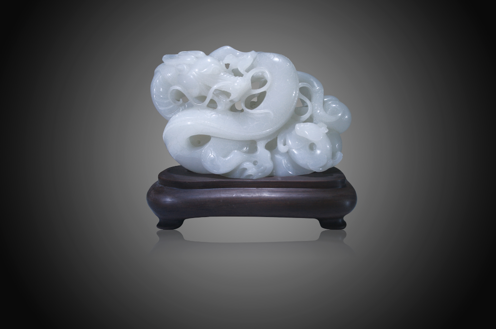 傳說龍能隱能顯,春風(fēng)時(shí)登天,秋風(fēng)時(shí)沉淵。又能興云致雨和騰云駕霧。龍后成為皇權(quán)、貴族、富貴象征。整幅作品,采用立雕形式構(gòu)思設(shè)計(jì),運(yùn)用鏤雕、圓雕等多種技法,雕工細(xì)膩,紋理可見。質(zhì)地晶瑩潤澤,打磨細(xì)致。一氣呵成,雕工師法自然,是一件以龍為主題的玉雕精品之作。