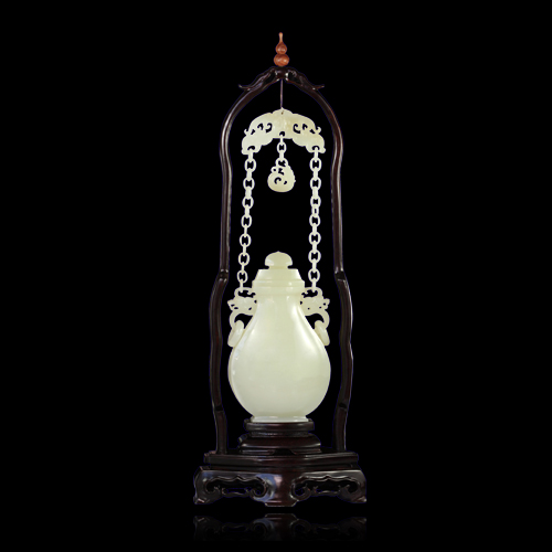 寶瓶玉質(zhì)縝密溫潤(rùn),水色晶瑩,且勻度、凈度極佳,為上等玉料。瓶身光素?zé)o紋,瓶腹渾圓飽滿(mǎn),兩只瓶耳上以無(wú)數(shù)活環(huán)相連系于一玉片作為提梁,與寶瓶成為一體,完美無(wú)缺,瓶肩以如意為耳,各置一活環(huán)。