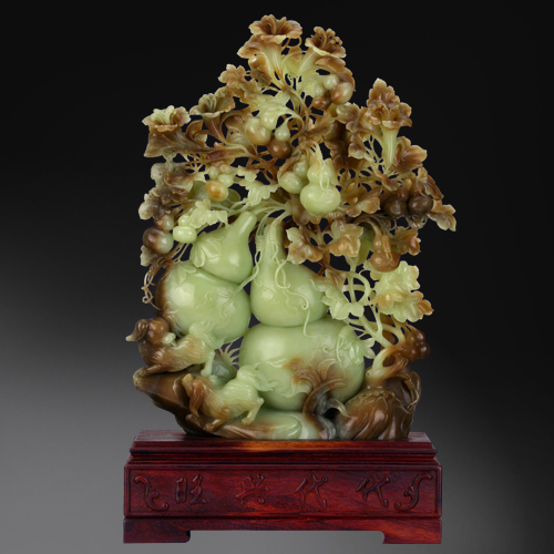 作品中雕刻一顆葫蘆藤,兩顆大葫蘆,藤上掛著幾顆小葫蘆,雕工精湛,形象逼真。葫蘆自古被視為一種寶物,從葫蘆里倒出來的藥品能治百病,使人健康長壽。又因葫蘆多子,舊時(shí)寓意多子多孫多福氣。
