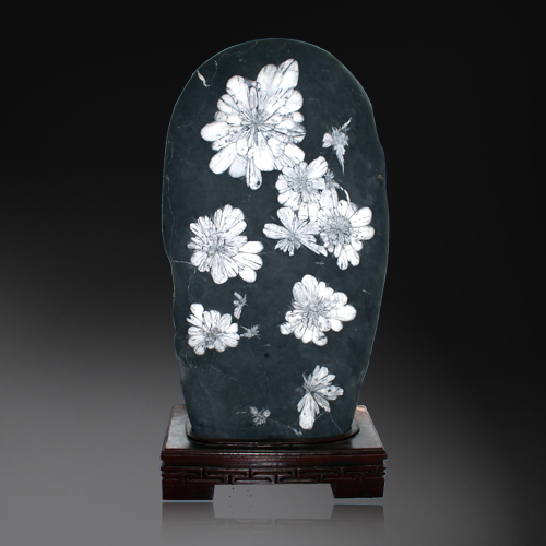 天然菊花石是瀏陽河天青石中含凸鏡狀灰?guī)r,經(jīng)數(shù)億年地質(zhì)變化,演變而成。乳白色天然花形,酷似盛開的朵朵菊花,紋理清晰,界線分明,質(zhì)地堅實,花形千姿百態(tài),蔚為奇觀,潔白美麗的花瓣是由天然的天青石和方解石組成。中華人民共和國地質(zhì)礦產(chǎn)部將其列入寶石類,并命名“玉疊妃”。因其蘊量稀少,比珠玉寶石類更珍貴。故又被稱為“全球第一”。 菊花石的發(fā)掘,雕刻成工藝品,則始于清乾隆年間,當時只作宮庭貢品,后才在民間流傳。一九一五年巴拿馬萬國博覽會上,菊花石雕“梅、蘭、竹、菊”橫屏參展,榮獲金獎,震驚世界,驚嘆“石頭能開花”,從此享譽全球。