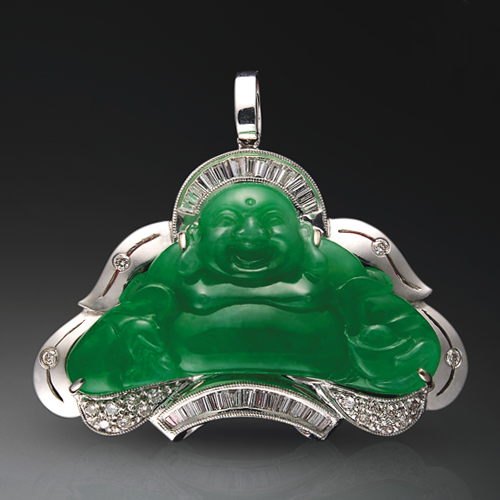 滿翠綠色,色澤均勻濃艷,細(xì)膩冰潤(rùn),配以奢華鑲鉆。