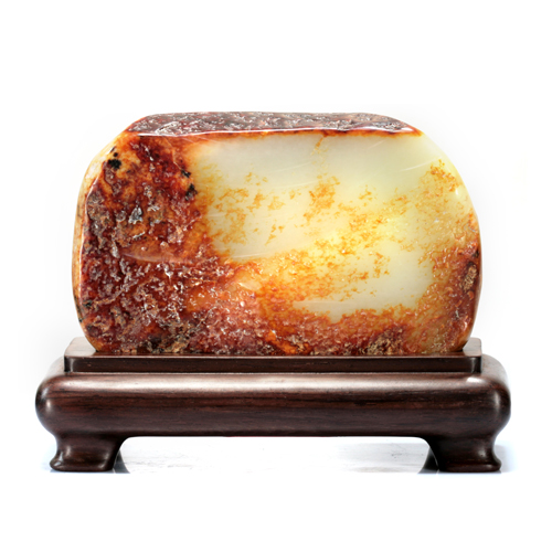 玉質(zhì)細膩縝密,油潤細濡,整器厚重,敦厚優(yōu)美,全身覆艷麗皮色乃棗紅與濃淡不一的黃色相間,醒目喜慶,色澤誘人。其尺寸大小適正,展、供、仰、賞俱佳。