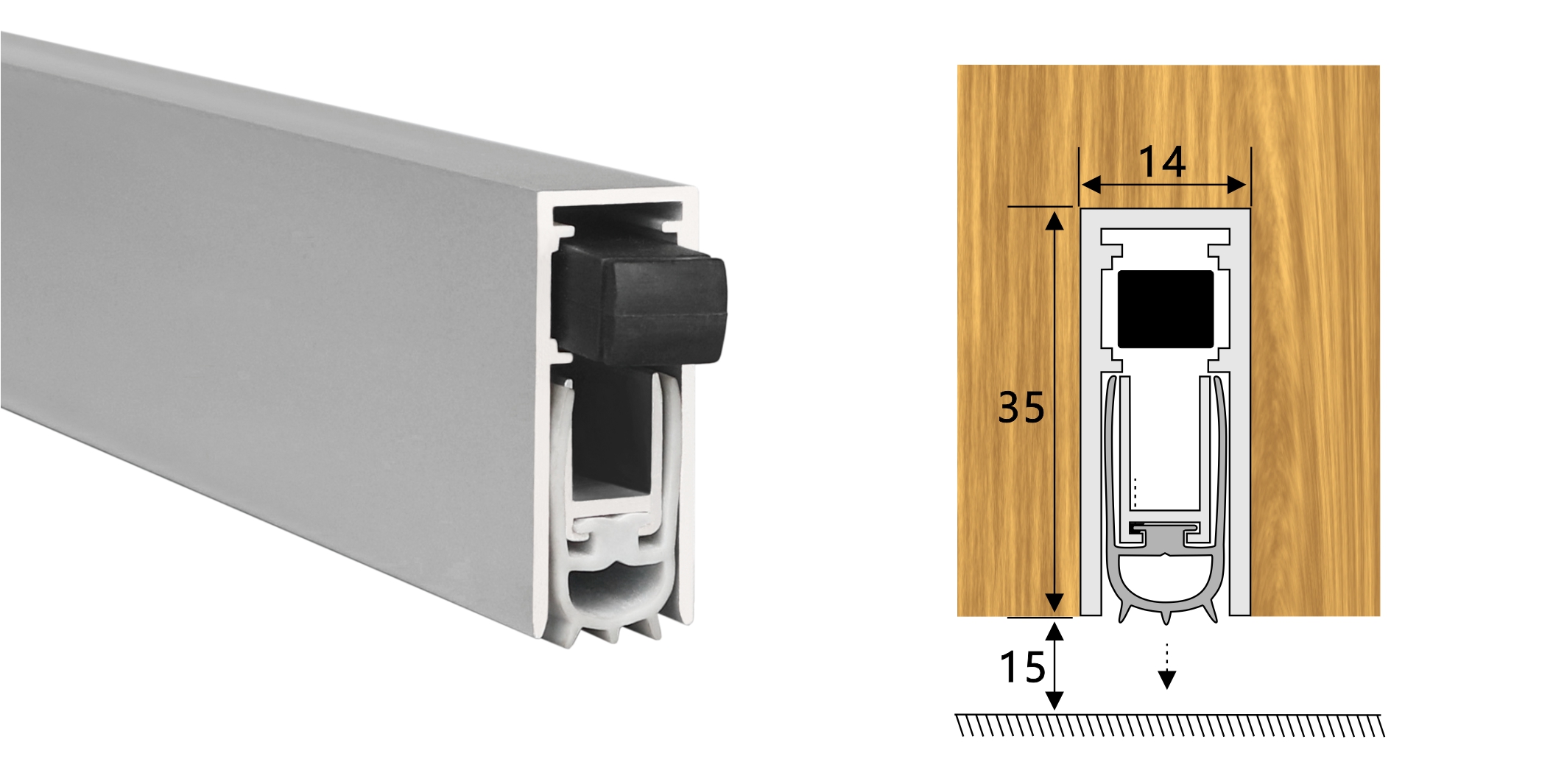 嵌入式門底自動升降式密封器,四連桿機構,適用于門扇內開槽的門。安裝時需在門底加工一條35mm*14mm的通槽,將產品放置其中,將兩端蓋板和密封器用螺絲固定,使用本產品不影響門的整體風格。