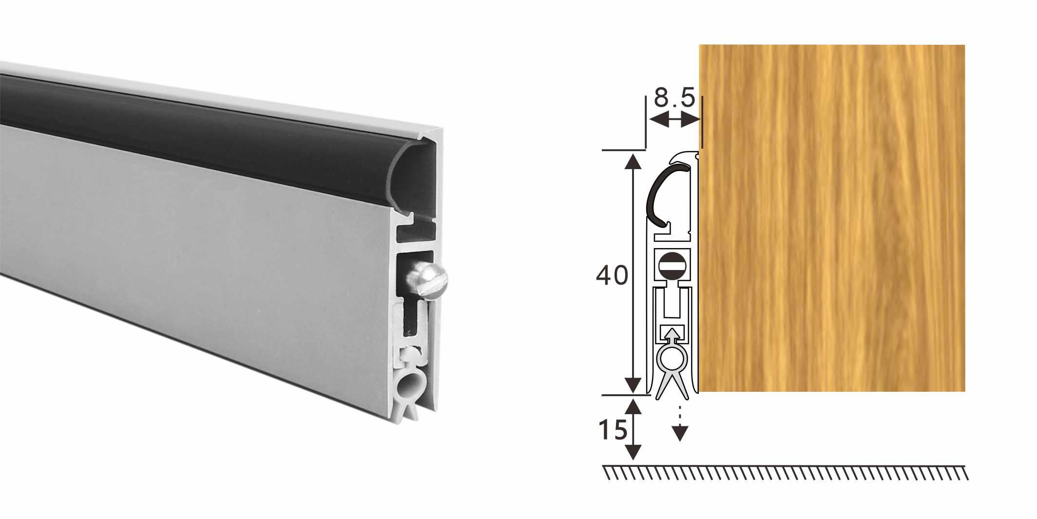 外裝式門底自動升降式密封器,安裝在門底表面,適用于后補工程,如已安裝到位的門需要增加隔音,隔溫,防